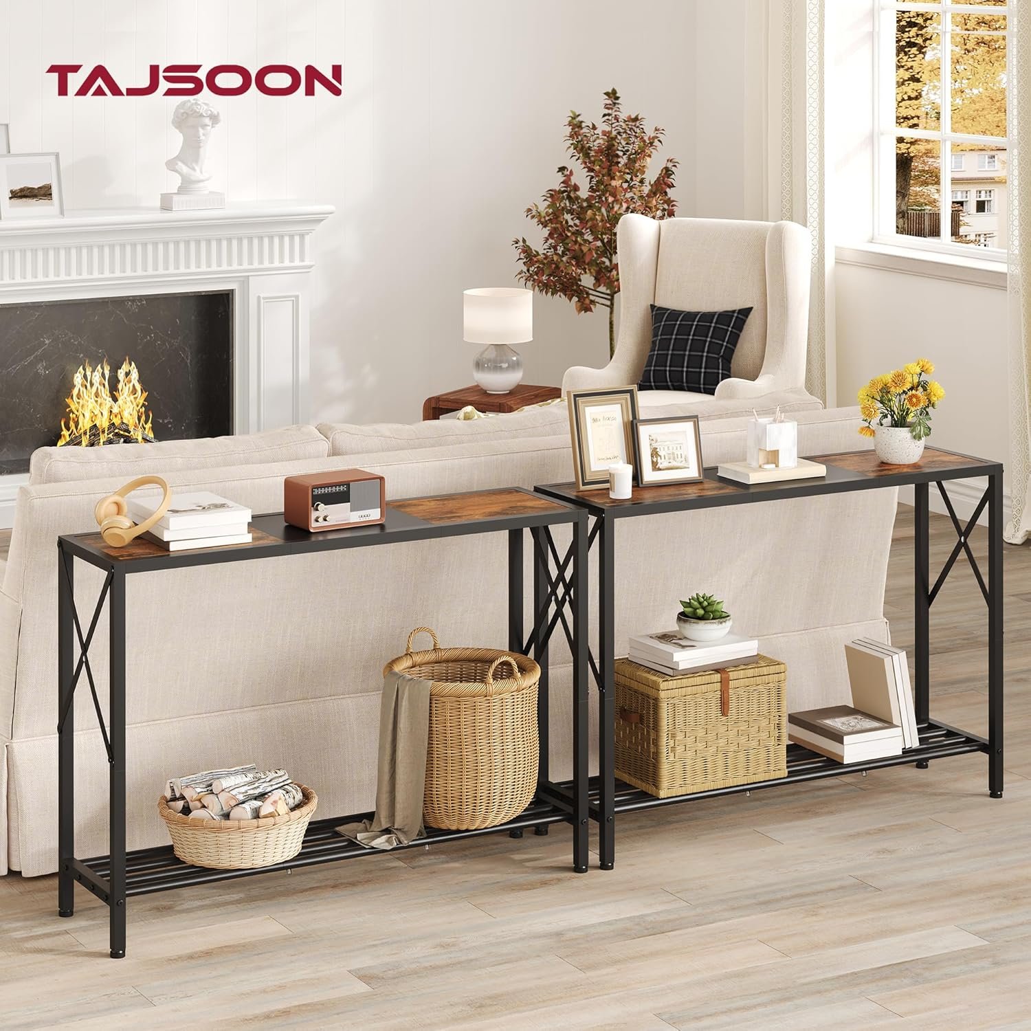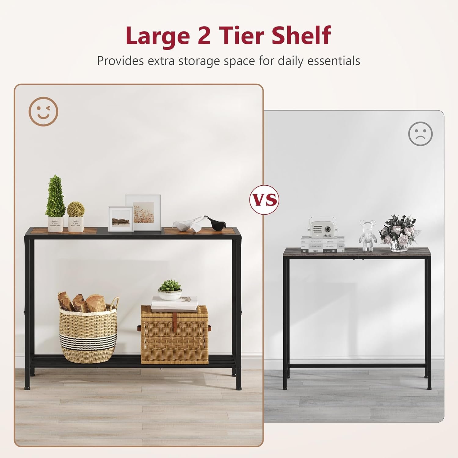 The Tajsoon Console Table 41.8” features a stylish industrial design with rustic brown and black finishes, perfect for entryways, hallways, living rooms, foyers, corridors, or offices. This two-tier narrow sofa table maximizes small spaces while providing ample storage with its sturdy shelves, combining functionality and modern rustic charm. Crafted for durability and versatility, it complements various interior styles while offering practical organization solutions for your home or workspace.